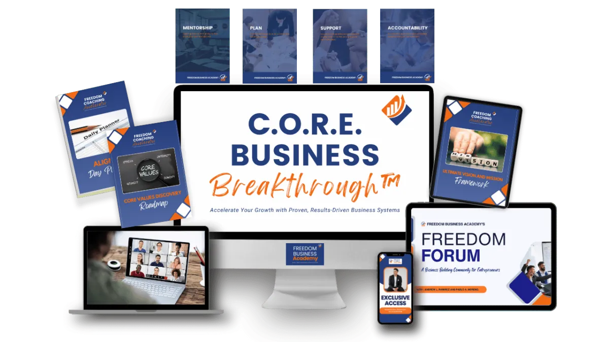 Through our C.O.R.E. Business Breakthrough™ framework and AI-powered tools—Freedom Bot and Freedom Flow™—we help leaders remove bottlenecks, install repeatable processes, and build momentum that lasts.